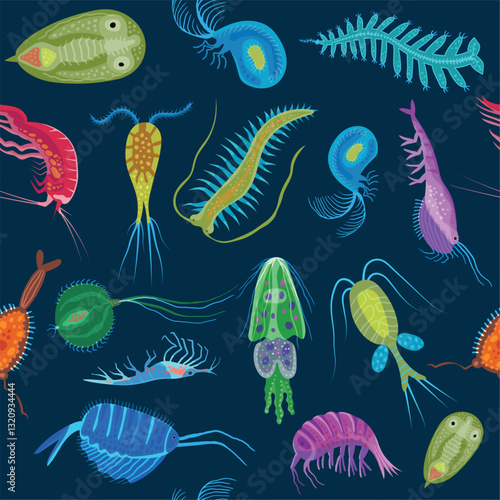 Plankton, marine and freshwater microscopic organism set, flat vector isolated illustration. Phytoplankton and zooplankton under microscope, living creatures.
