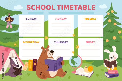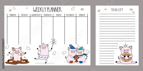 Planner vector template with cute sleeping animals fox, deer, owl, bear, raccoon and night sky landscape. Organizer and schedule with place for notes and To do list.