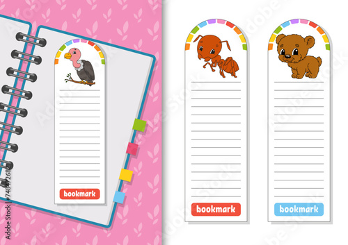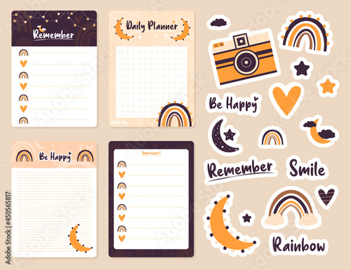 Planner vector template with cute space animals panda, raccoon, cat, fox, rockets, planets, constellations. Organizer and schedule with place for notes and To do list.