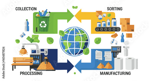Plastic recycle process scheme vector. Factory for waste sorting and recycling infographic isometric illustration. Reducing pollution and garbage, saving earth and environment concept