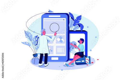 Podcast vector flat style design illustration. Big smartphone and tiny people listening to podcast audio programmes on mobile phone, laptop computer, portable media player.