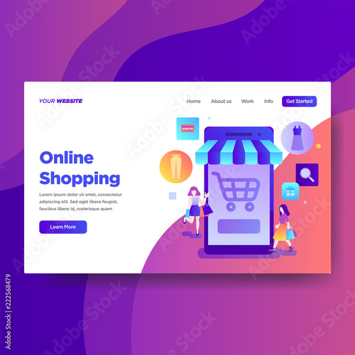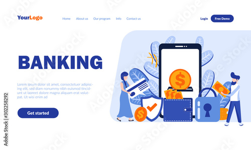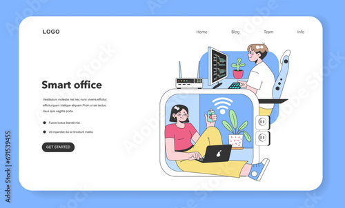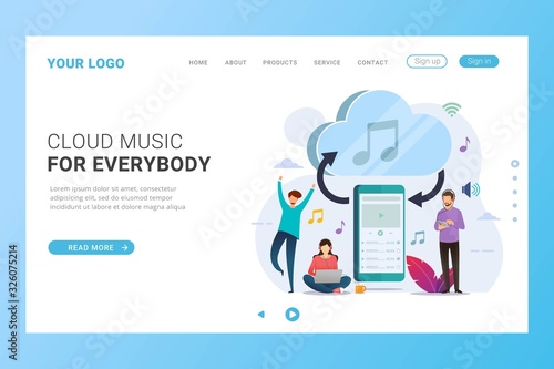 Podcast listening vector website template, web page and landing page design for website and mobile site development. Man and woman in earphones listening to podcasts via smartphone.