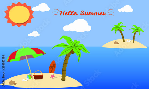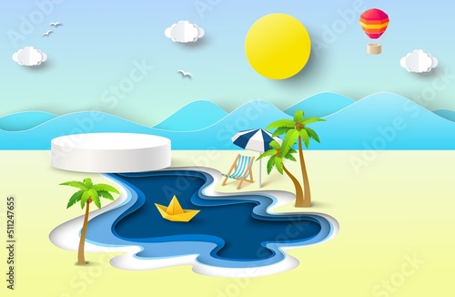 Podium on tropical summer papercut vector background. Circle stage on seaside or river beach craft origami art mockup template. Advertising poster or banner design