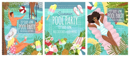 Pool party concept vector illustration. Summer vacation at poolside. Happy people swim in swiming pool. Hand drawn poll party posters set.