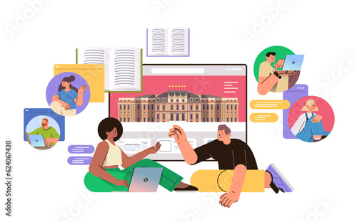 Pool party set of vector illustration. Summer vacation at poolside. Happy people swim in swiming pool, drink and dance. Pool party with DJ.
