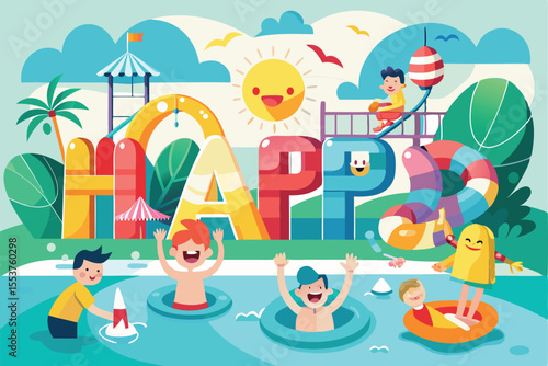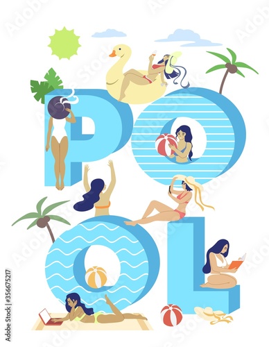 Pool typography vector banner template. Happy girls in swimsuits sunbathing, relaxing on inflatable swan swimming ring, reading book, using laptop, playing ball etc. in swimming pool. Summer vacation.