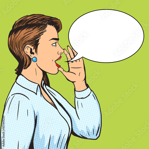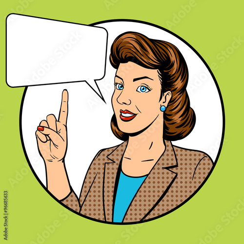 Pop art retro style woman point hand sign with speech bubble. Comic hand drawn design vector illustration.