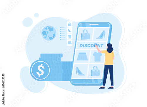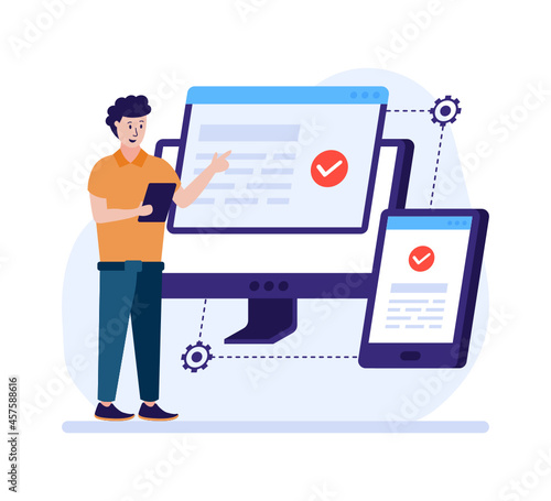 Huge pos terminal with receipt, micro male and female characters making purchases using credit card, vector flat style design illustration. Contactless payment, complete transaction, payment terminal.