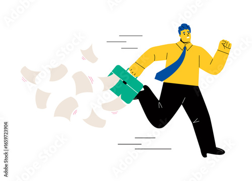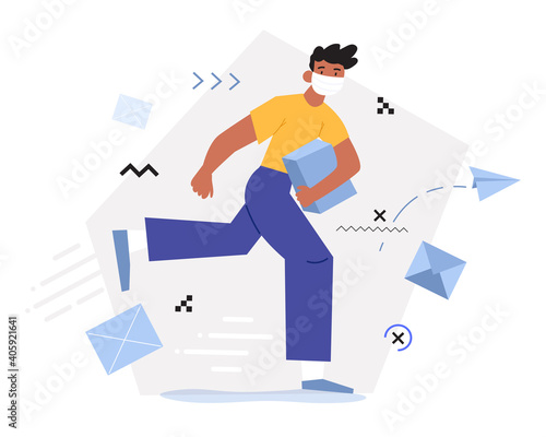 Postman running with postbag over his shoulder and letter in hand, vector flat illustration isolated on white background. Postal services, correspondence delivery concept for web banner, website page.