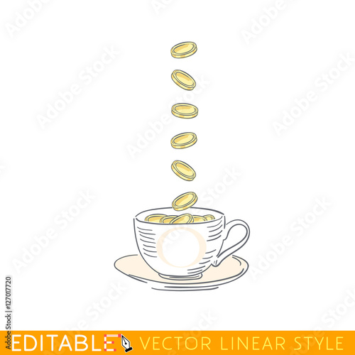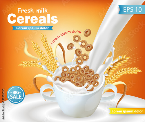 Pouring milk and falling oat flakes vector icon. Healthy food or drink package realistic design element isolated on white background