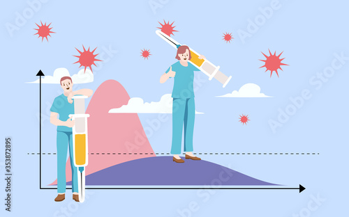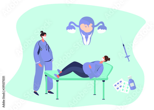 Pregnant woman giving childbirth lying in bathtub or birth pool, flat vector illustration. Birth position, labour and delivery in warm water, pain relief.