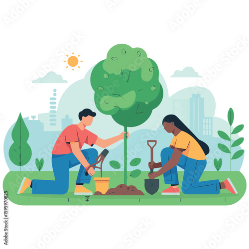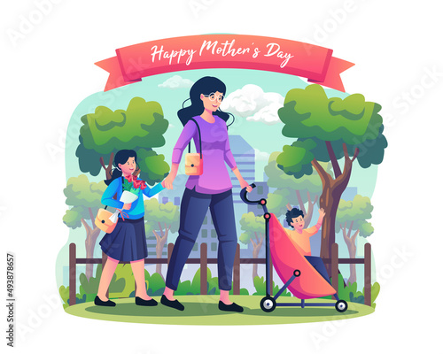 Vector illustration of happy family husband and his pregnant wife walking in the park holding hands. Pregnant woman future young mother flat style design element.