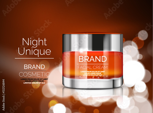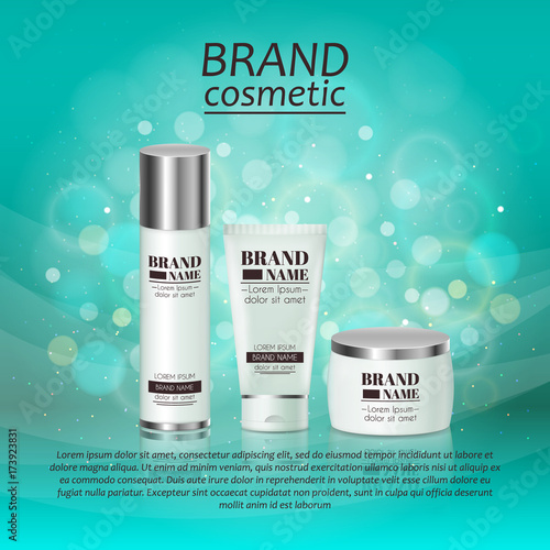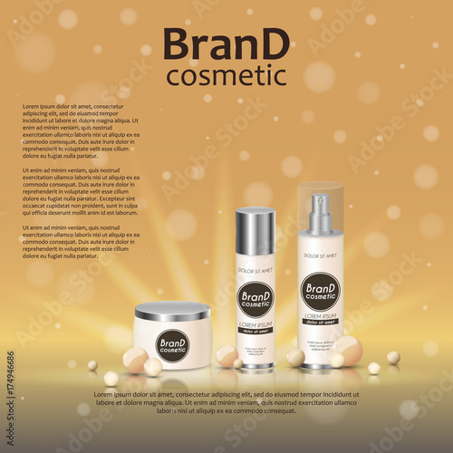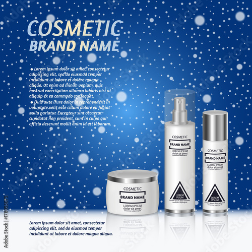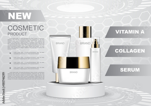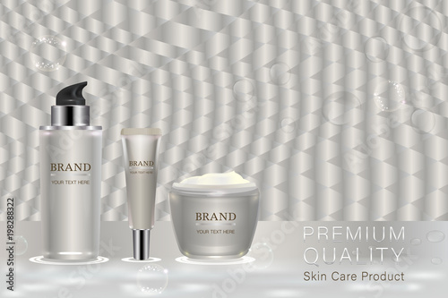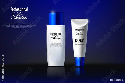 Premium cosmetic products ad. Vector 3d illustration. Skin care brand bottle template design. Face and body make up cream and lotion.