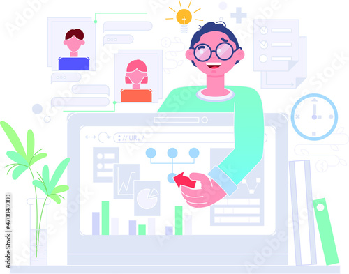Pretty young woman character relaxing eating, drinking wine, watching video on laptop computer while taking bath at home vector illustration