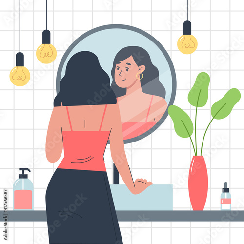 Pretty young woman with perfect body taking shower in home bathroom vector illustration. Hygiene cleanliness and beauty procedure