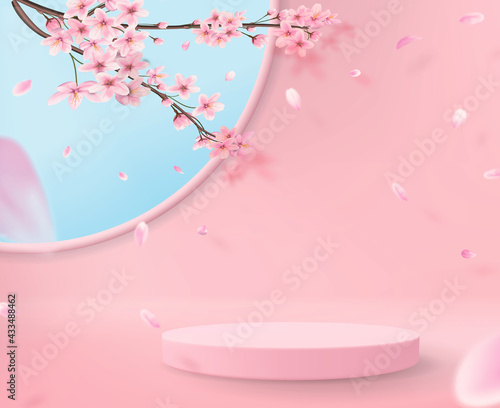 Display podium mockup, paper cut sakura tree branch with flowers, cherry blossom, vector illustration. Spring background, floral pedestal, stage for beauty and cosmetic product ads.