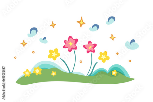 Display podium mockup, paper cut spring flowers and leaves, vector illustration. Fresh spring nature background, pedestal, stage for beauty and cosmetic product ads.