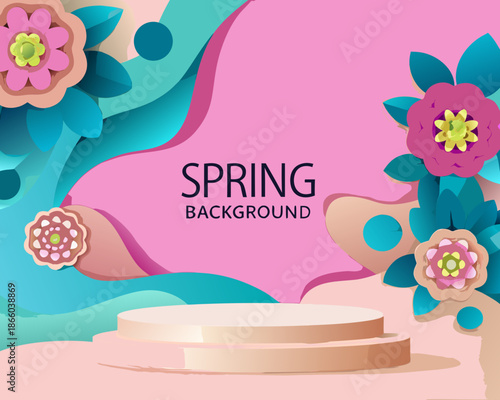 Round display podium mockup, paper cut spring flowers and leaves, vector illustration. Spring floral background, pedestal, stage for beauty and cosmetic product ads.