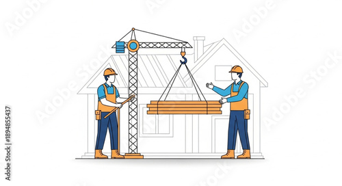 Professional construction engineers and architects in helmets discussing architecture project of modern city buildings, flat vector illustration. House building industry, construction development.