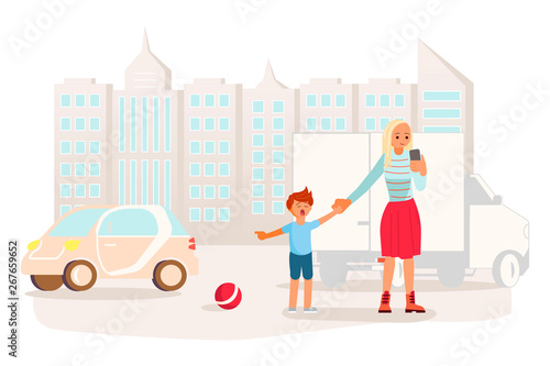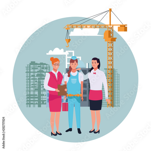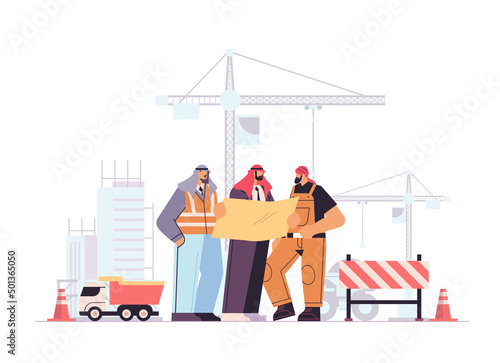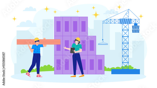 Professional construction engineers and architects in helmets discussing architecture project of modern city buildings, flat vector illustration. House building industry, construction development.