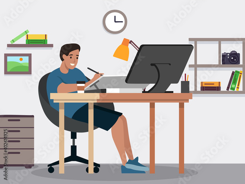 Vector illustration of young man system administrator or programmer working on computer. Creative team people flat style design element, icon isolated on white background.