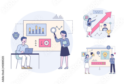 Project management concept vector illustration. Business team working together with project data dashboard in the office.