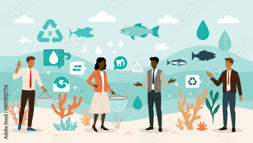 Male and female characters promoters presenting commercial brand identity, flat vector illustration. People making cup, t-shirt, gift box with company logo. Corporate identity advertising. Branding.