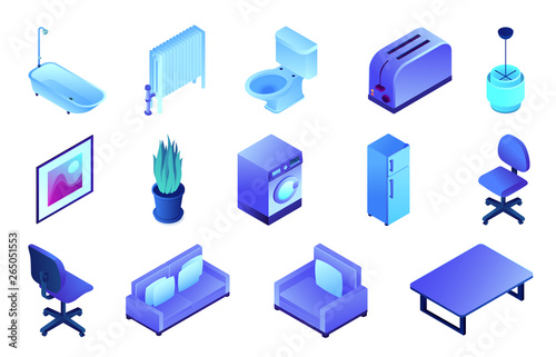 Promotion equipment vector icon set. Isometric white blank exhibition display stand, trade show booth, flag banner mockup set.