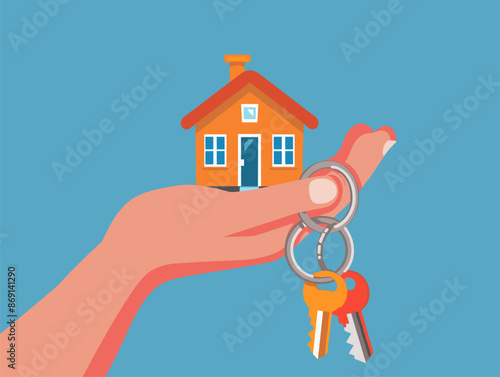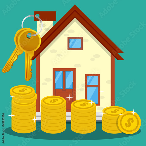 Property Investment concept. House and real estate money investment. Building placed next to coin stack. Dollar symbols and design elements.