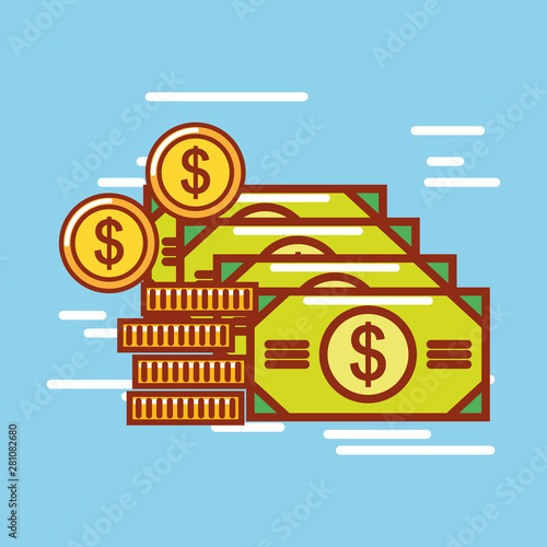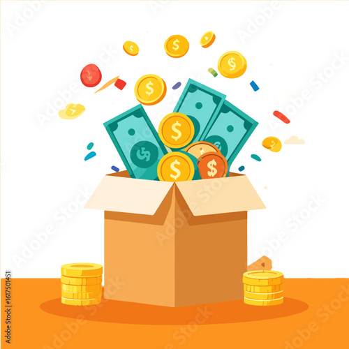 Property Investment concept. House and real estate money investment. Building placed on coin stack. Dollar symbols and design elements.