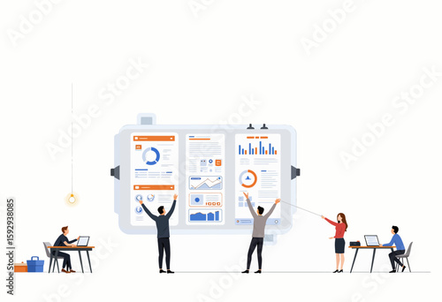 Pros and cons, advantage and disadvantage consideration vector illustration. Bad and good idea, plus and minus, negative or positive opinion. Tiny people solving problem over huge notebook design