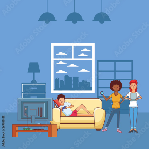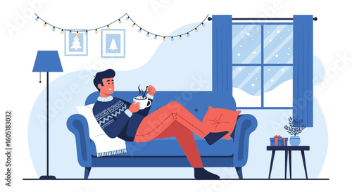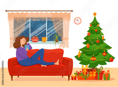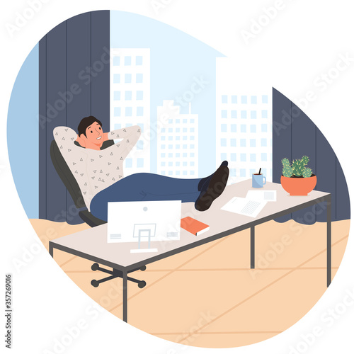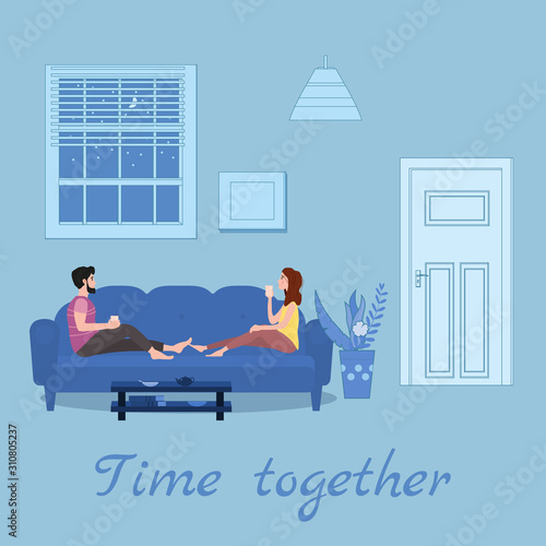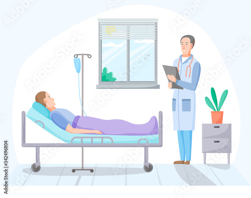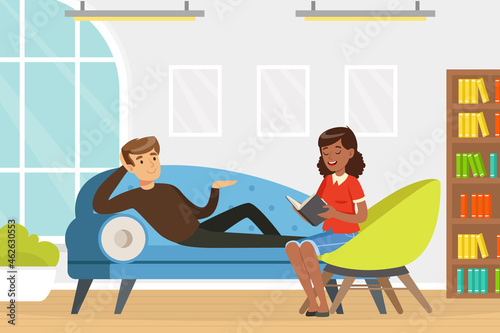 Vector illustration of doctor female sitting next to lying on couch male. Psychologist or psychiatrist listening to problems of patient. Psychotherapist flat style design.
