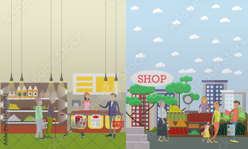 Vector illustration of mature people doing shopping in grocery store and in fruit and vegetable market stalls. Flat style design.
