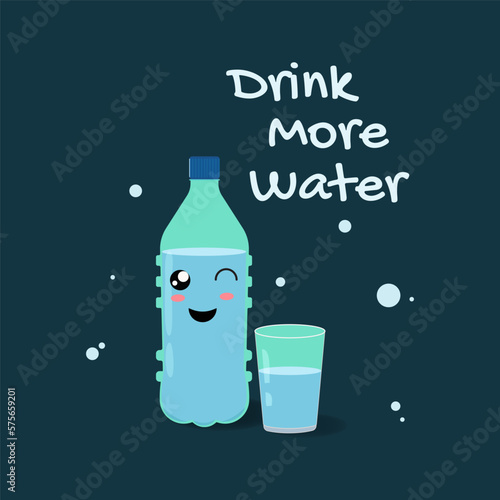 Drinking water ad vector realistic illustration. Glass of clean pure sparkling drink water and plastic bottle with label on blue background with bubbles, ice cubes. Brand advertising poster template.