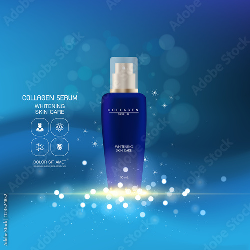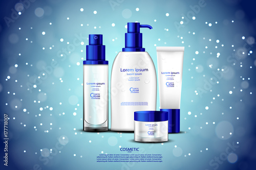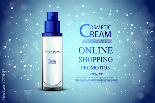 Drinking water ad. Vector realistic illustration of big plastic bottle and glass of pure clean water, bubbles, ice cubes, water pouring. Brand advertising poster template.