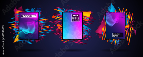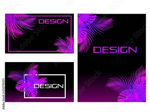 Purple neon frame set with tropical banana, monstera plants, palm tree leaves, vector isolated illustration. Fluorescent colors exotic jungle plant leaves borders.