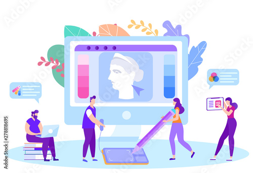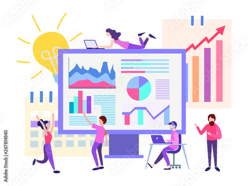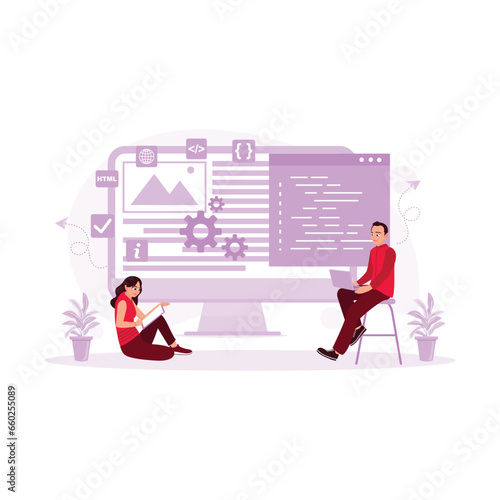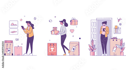 Happy male and female characters doing shopping with smartphone QR code scanning and paying within the app, vector illustration. Barcode scanning, verification app concept.
