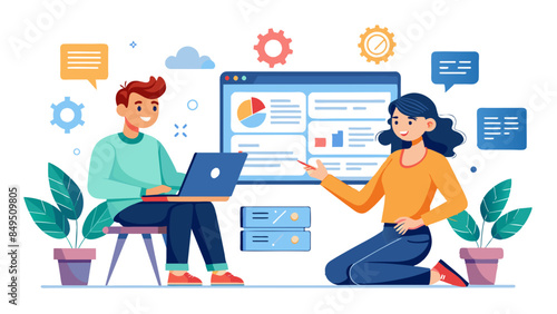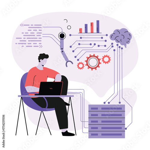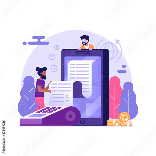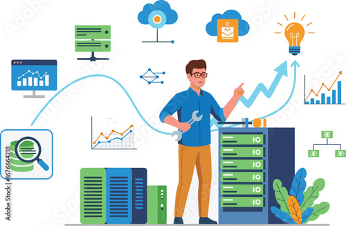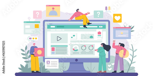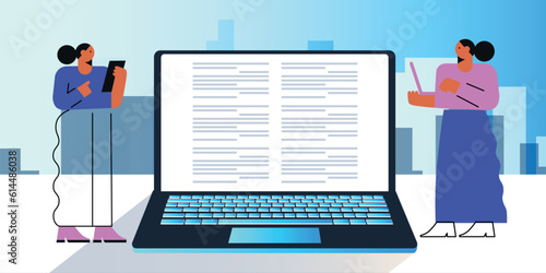 Quantum computer engineering vector poster template. Group of people physicists engineers working with quantum computer chip, flat style design illustration. Quantum computation research.