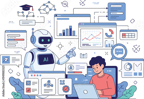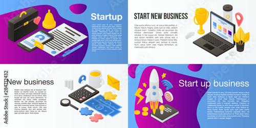 Quantum computing technology vector poster template set. Desktop with quantum computer, chip, shield. Quantum computing research, space exploration concept for flyer, banner etc.