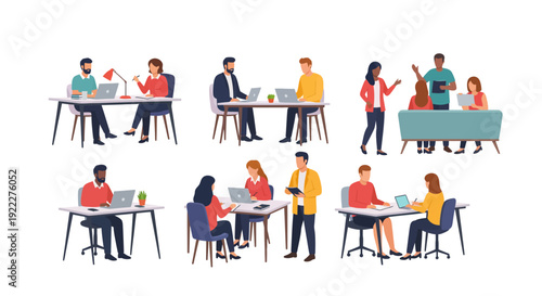 Radio podcast set, vector flat isolated illustration. People creating podcast in studio and listening to audio programs on smartphone and laptop computer. Podcasting, online radio.