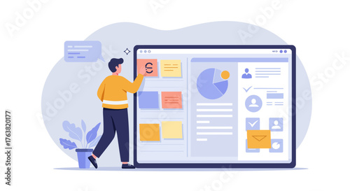 Raffle drum, balls with lucky numbers, man player filling out lottery tickets, flat vector illustration. Lotto, bingo, keno lottery games.