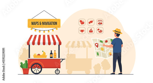 Rafting equipment and protective gear set, flat vector isolated illustration. Rubber raft inflatable boat, paddles, kayak, tent, suit, helmet, gloves, first aid kit, inflatable life jacket, backpack.