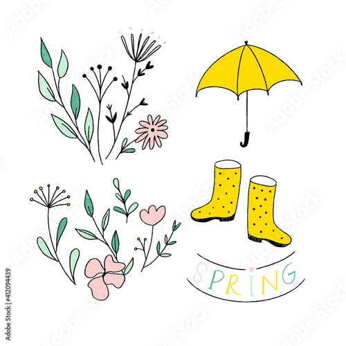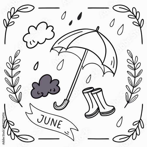 Rainy autumn vector flat style design illustration. Umbrella, rubber boots, clouds, pumpkin, acorns, mushrooms, leaves, cup of tea with lemon. Autumn composition for web banner, website page etc.