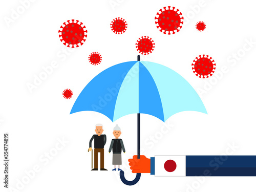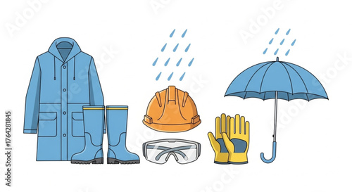 Rainy autumn vector flat style design illustration. Umbrella, raincoat, rubber boots, gloves, clouds, mushrooms, leaves and cup of tea with lemon. Autumn composition for web banner, website page etc.