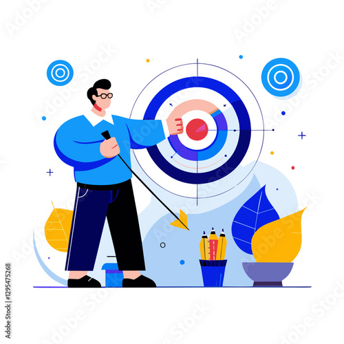Confident businessman climbing the mountain to reach business goal trophy cup on huge target, vector flat style design illustration. Reach the target, career development, leadership concept.
