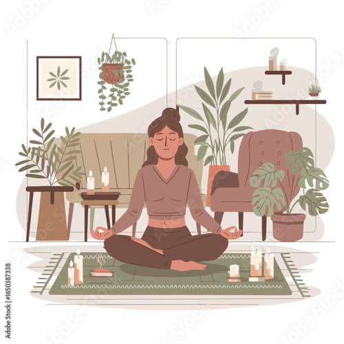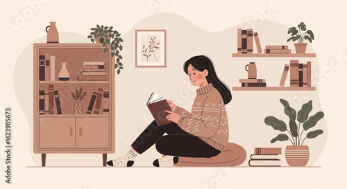 Young woman reading her favorite interesting book while sitting in cosy relax chair in living room at home, vector flat illustration. Reading books hobby, education, study literature.