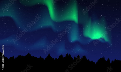 Realistic northern lights, vector illustration. Night sky and amazing polar lights, mountain landscape. Aurora borealis poster, banner template.