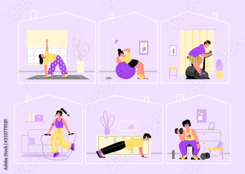 Athletes training on treadmill, with dumbbells in medical center or rehabilitation gym, vector flat illustration. Physiotherapeutic recovery after sport physical injury. Sports medicine and recovery.