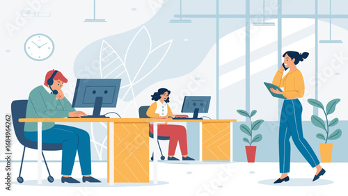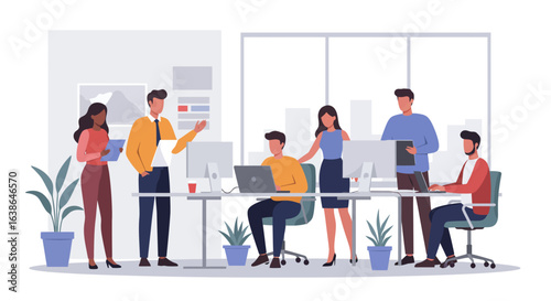 Staff recruitment or hiring concept. Vector isometric illustration of empty office chair, desk with computer and vacancy sign, employer and people searching for job.