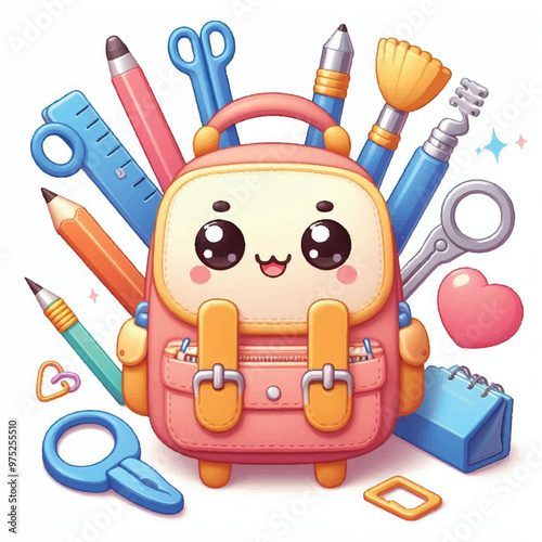 Red backpack with school supplies, vector isolated illustration. Realistic rucksack with zipper, pockets, straps. Children school bag with notebook, ruler, scissors, pens, pencils, paint brushes.